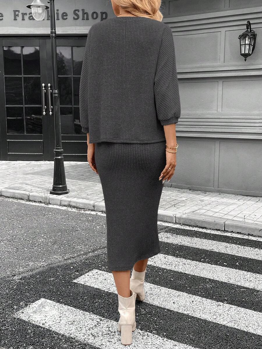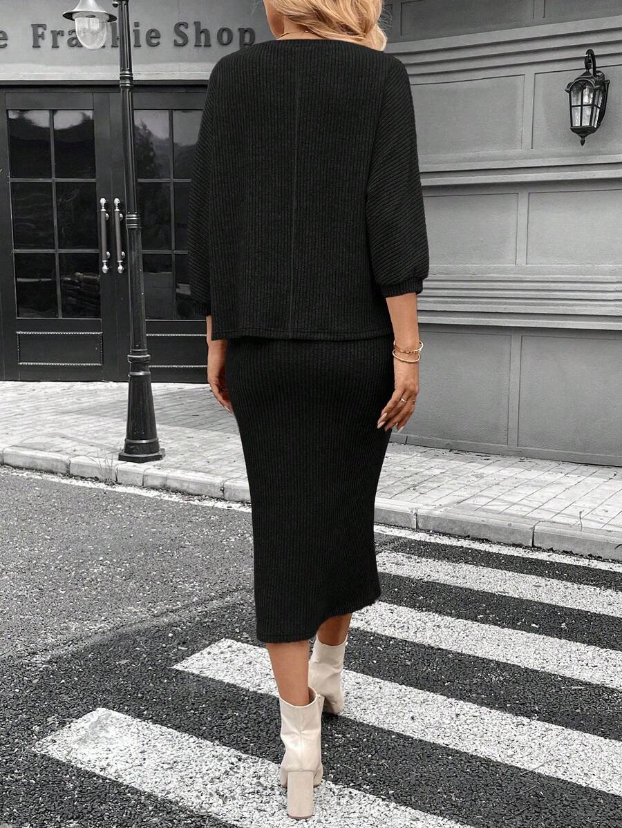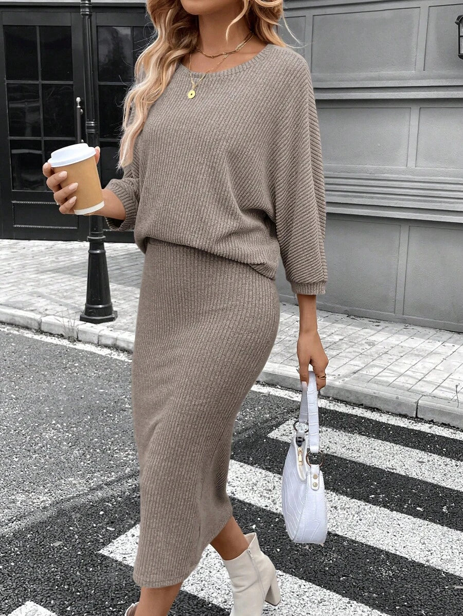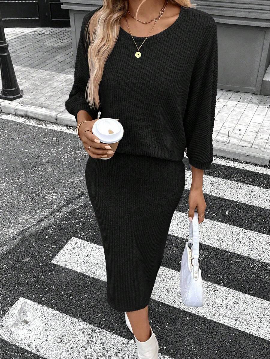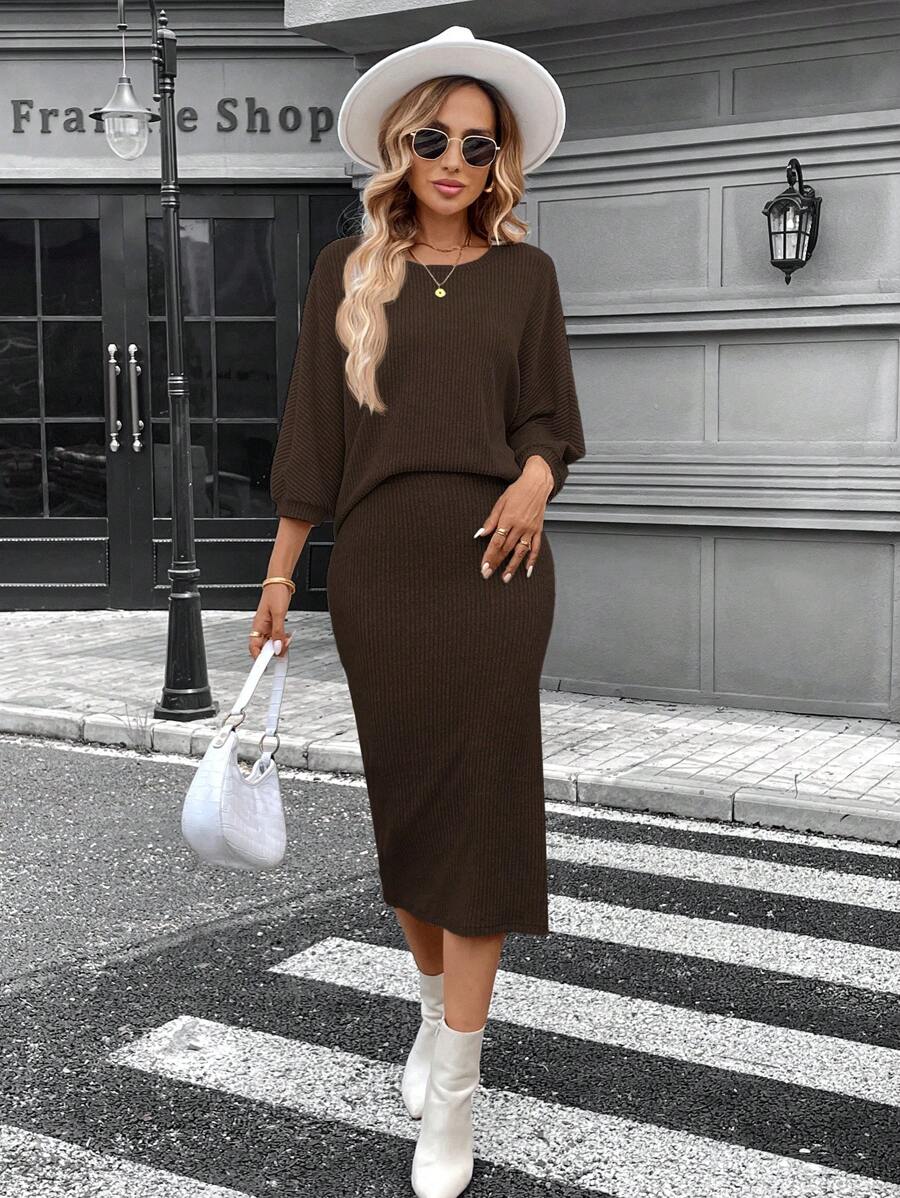 SHEIN LUNE Conjunto de camiseta feminina com gola redonda e manga morcego e saia reta justa, tecido com textura canelada felpuda, elegante para deslocamento casual, quente para outono/inverno