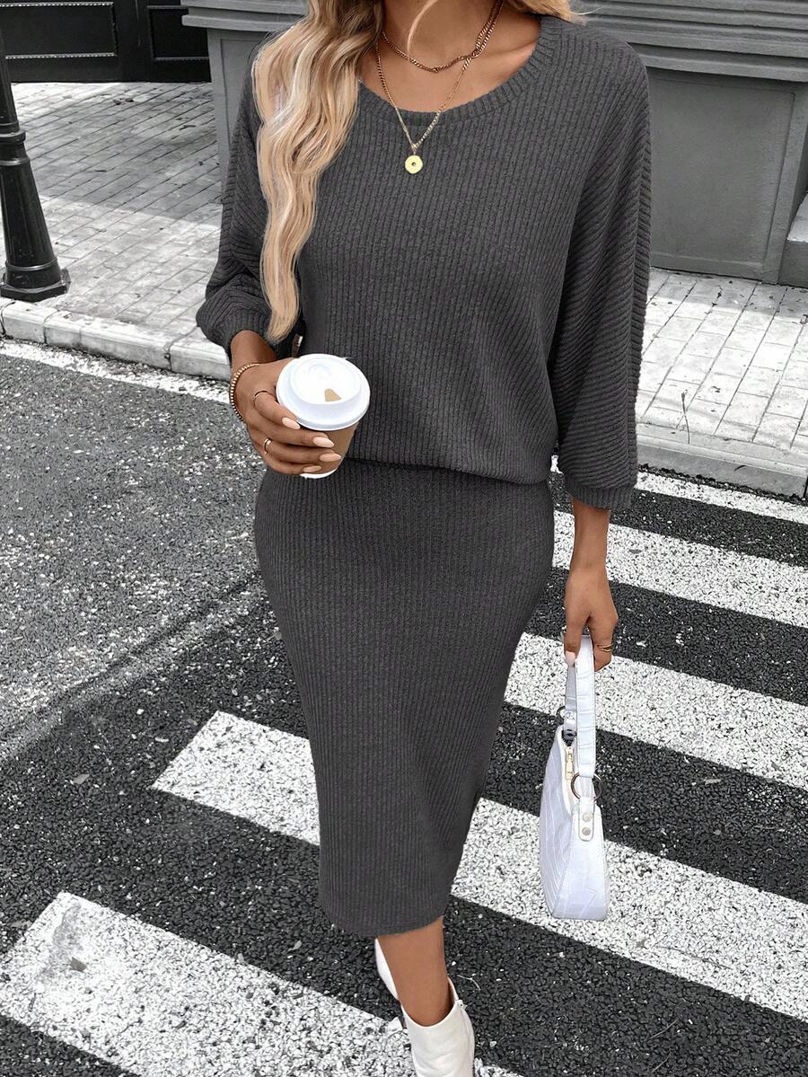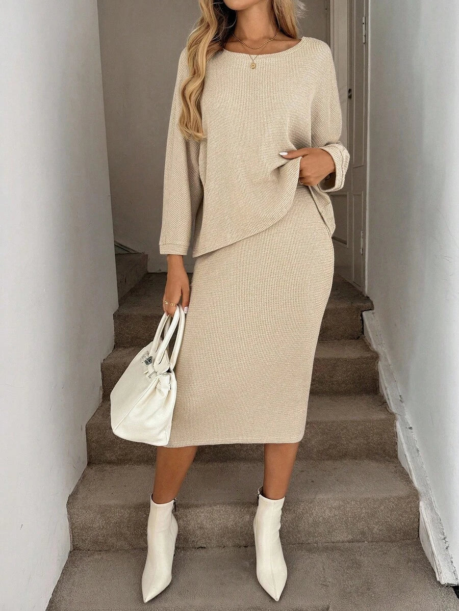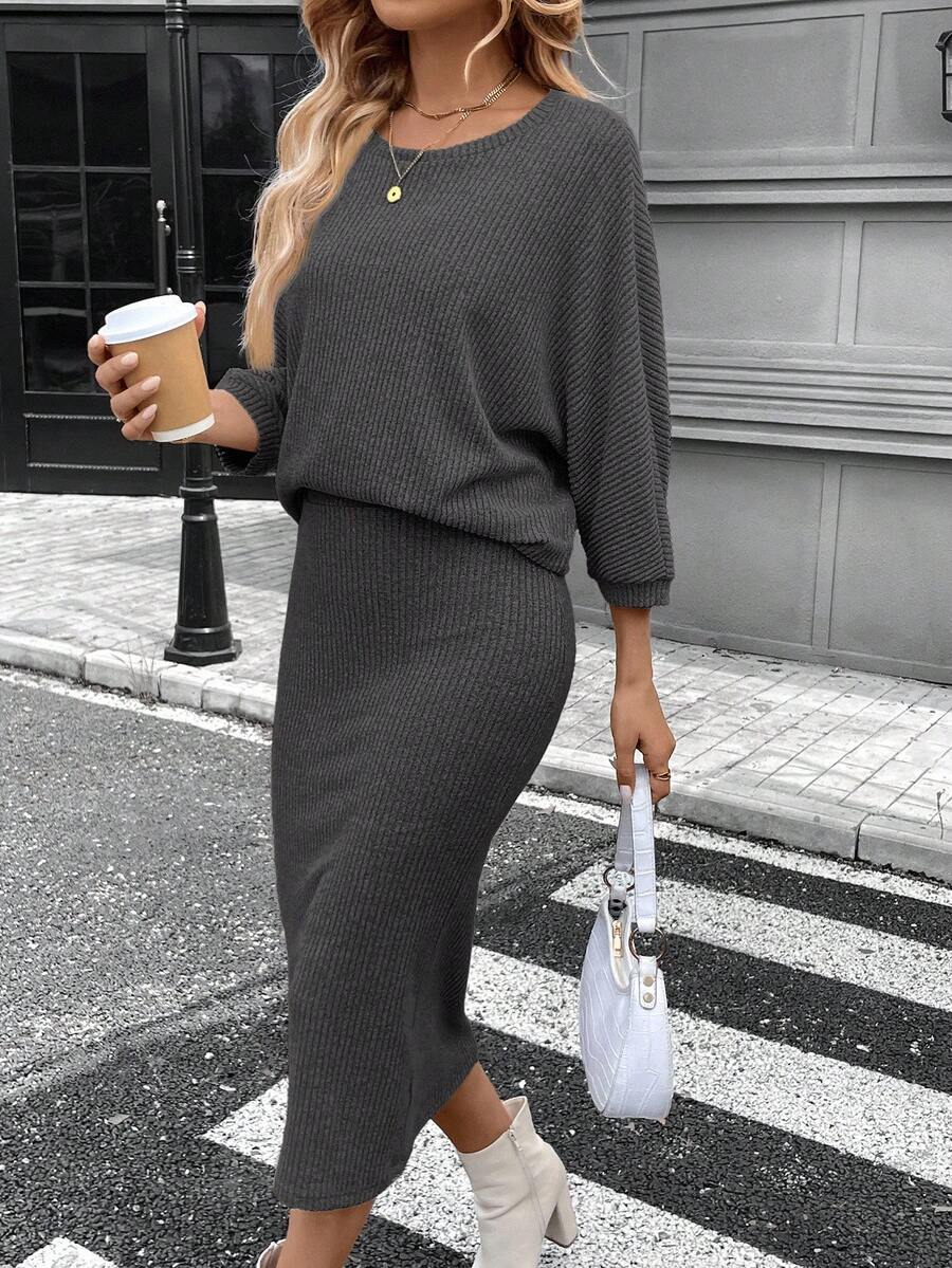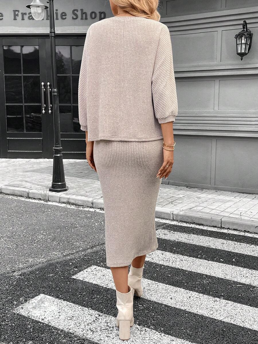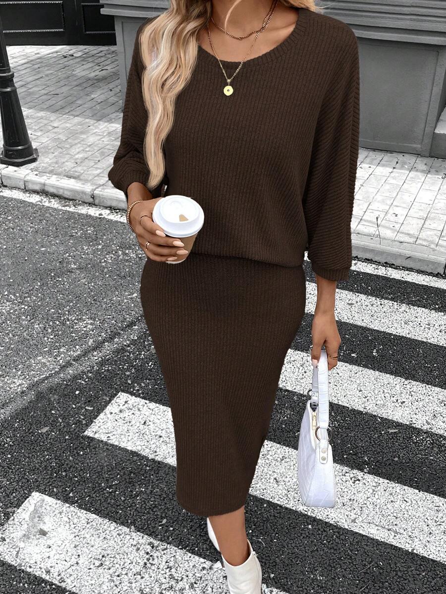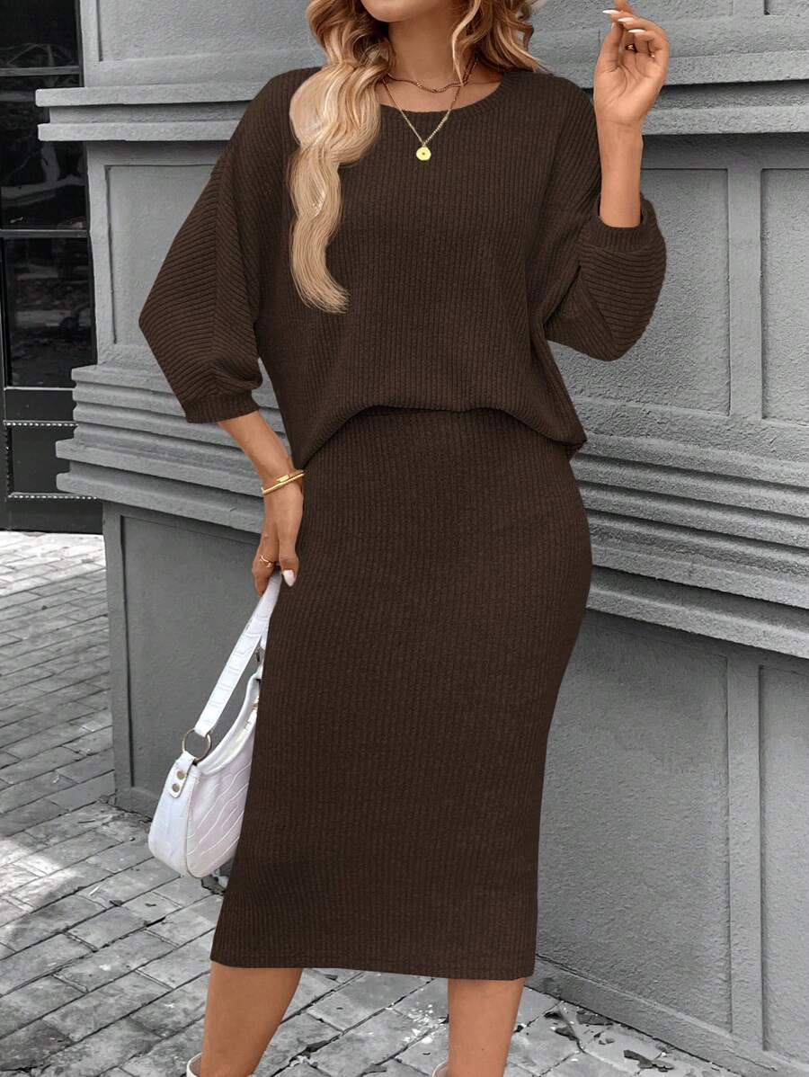 SHEIN LUNE Conjunto de camiseta feminina com gola redonda e manga morcego e saia reta justa, tecido com textura canelada felpuda, elegante para deslocamento casual, quente para outono/inverno