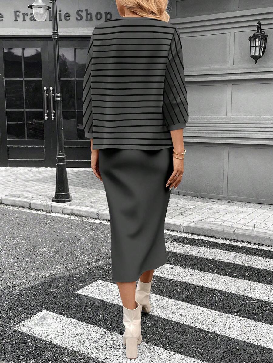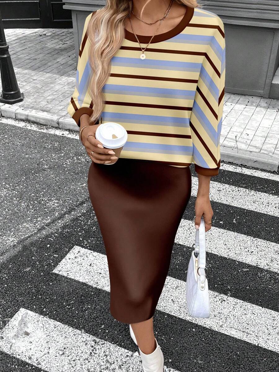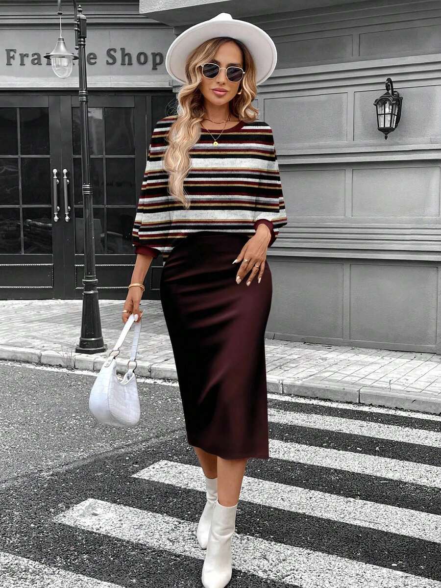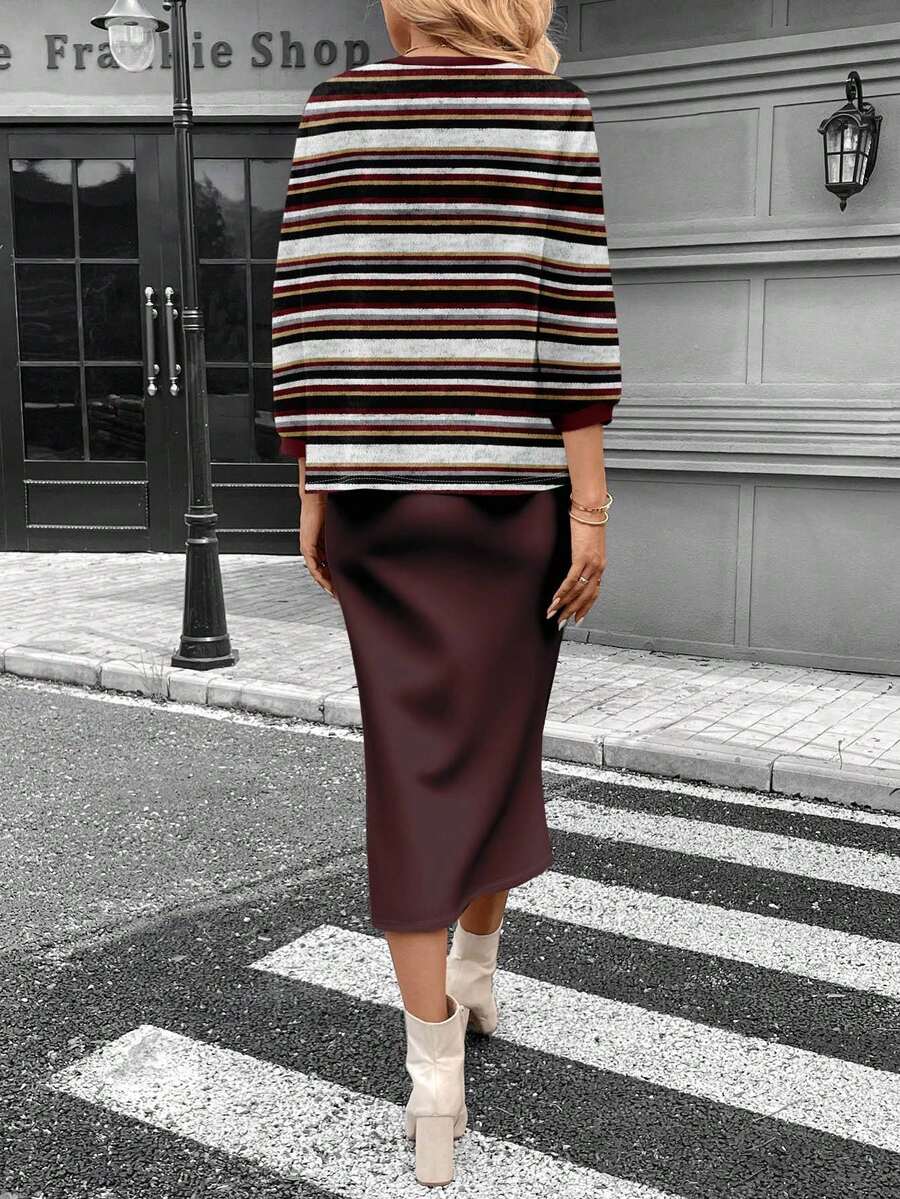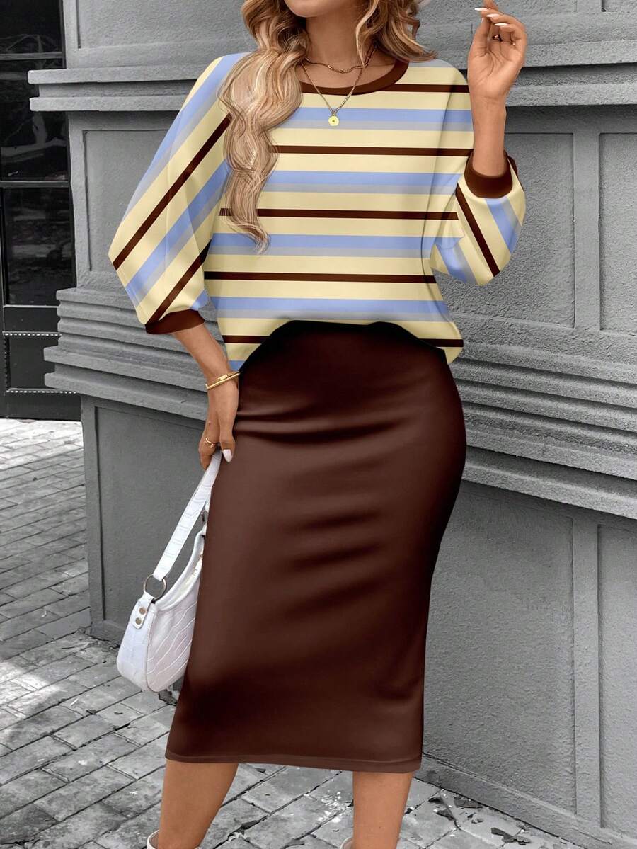 SHEIN LUNE Conjunto de camiseta feminina com gola redonda e manga morcego e saia reta justa, tecido com textura canelada felpuda, elegante para deslocamento casual, quente para outono/inverno