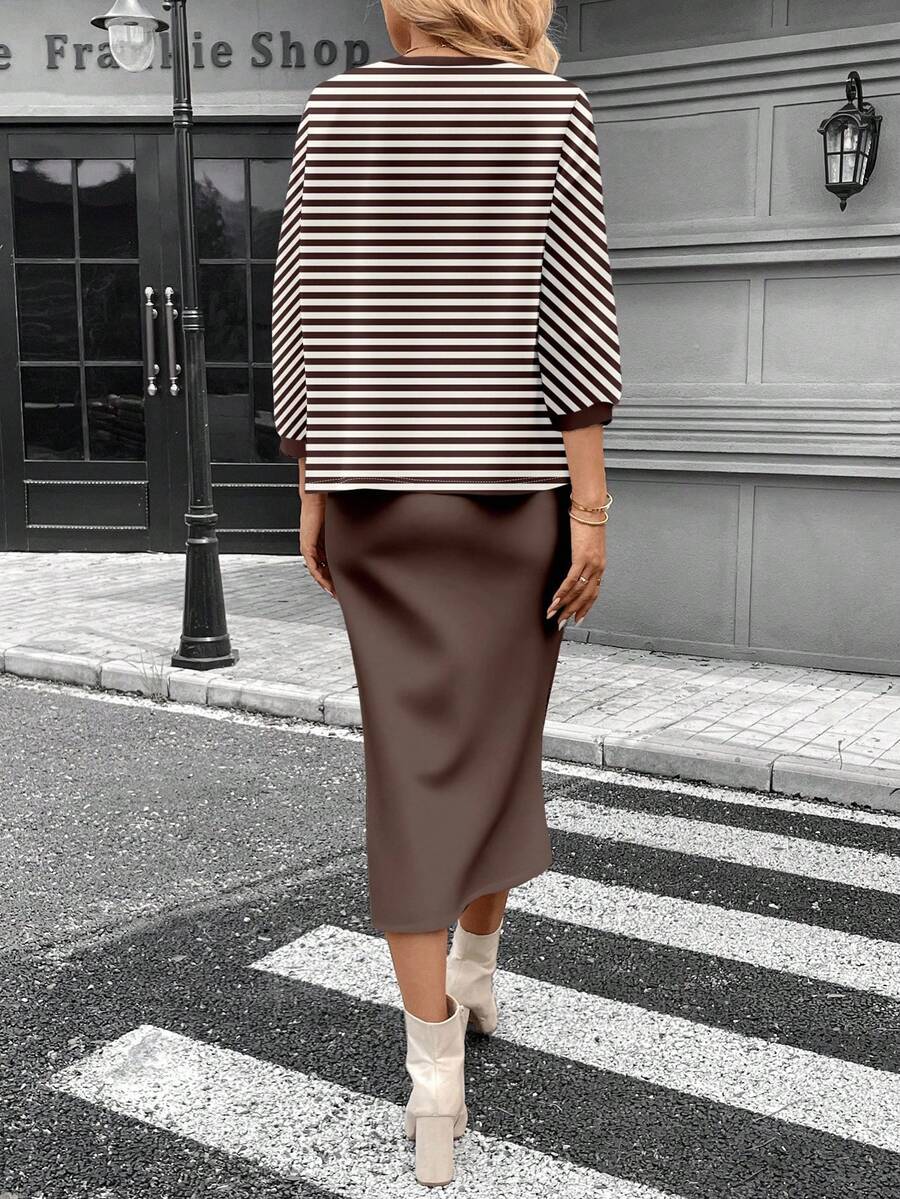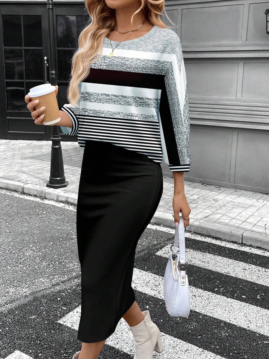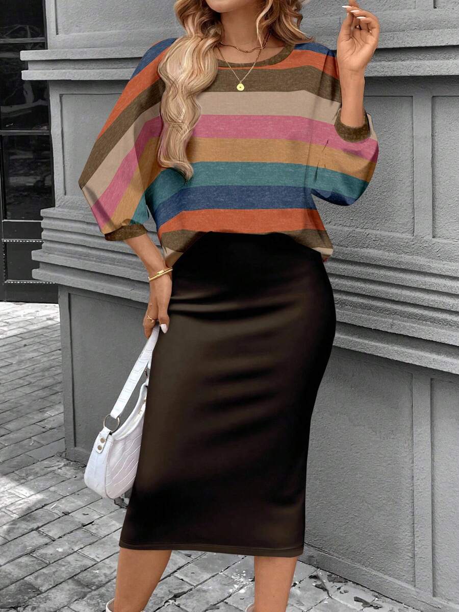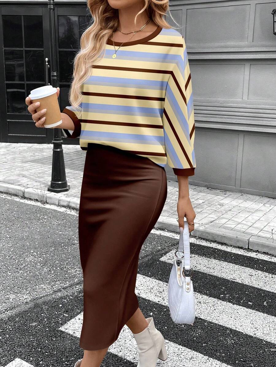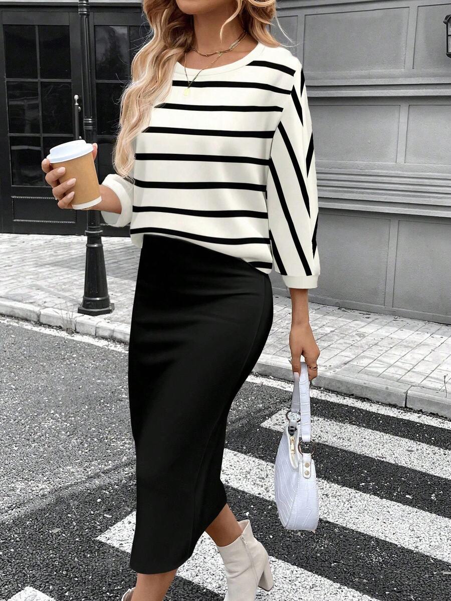 SHEIN LUNE Conjunto de camiseta feminina com gola redonda e manga morcego e saia reta justa, tecido com textura canelada felpuda, elegante para deslocamento casual, quente para outono/inverno