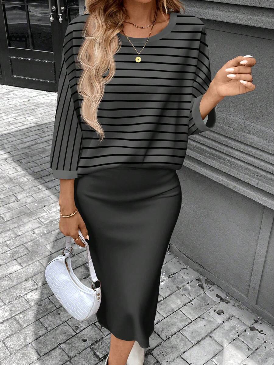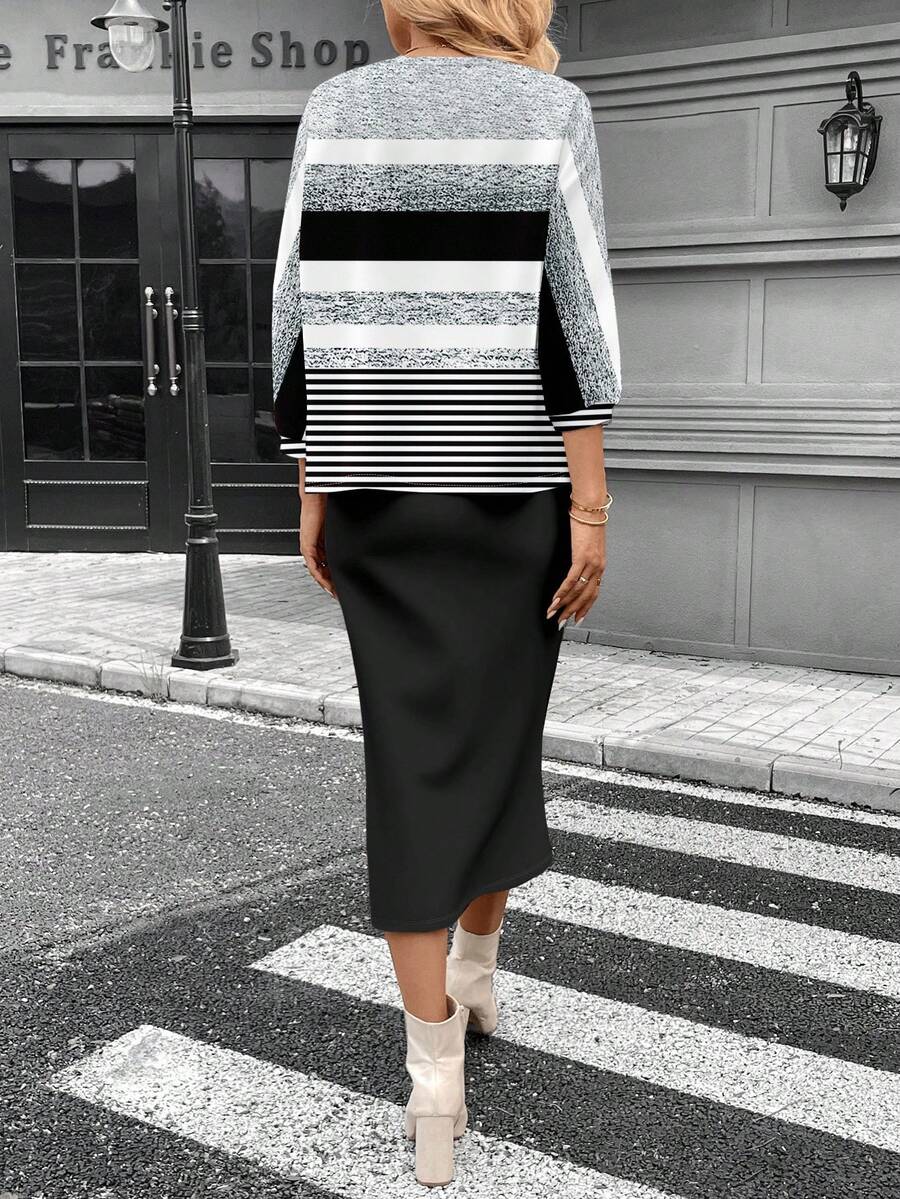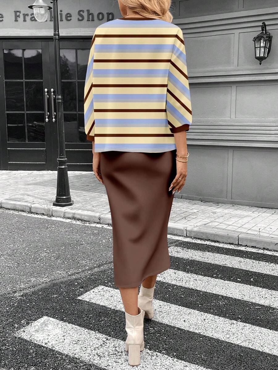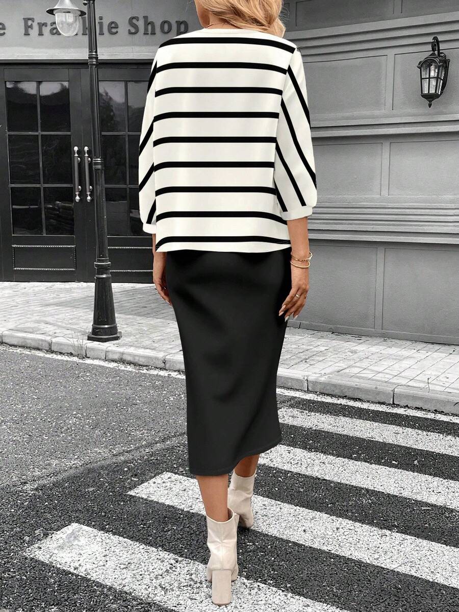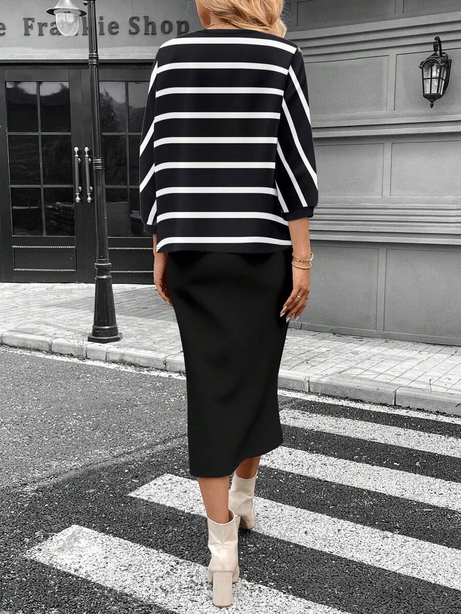 SHEIN LUNE Conjunto de camiseta feminina com gola redonda e manga morcego e saia reta justa, tecido com textura canelada felpuda, elegante para deslocamento casual, quente para outono/inverno