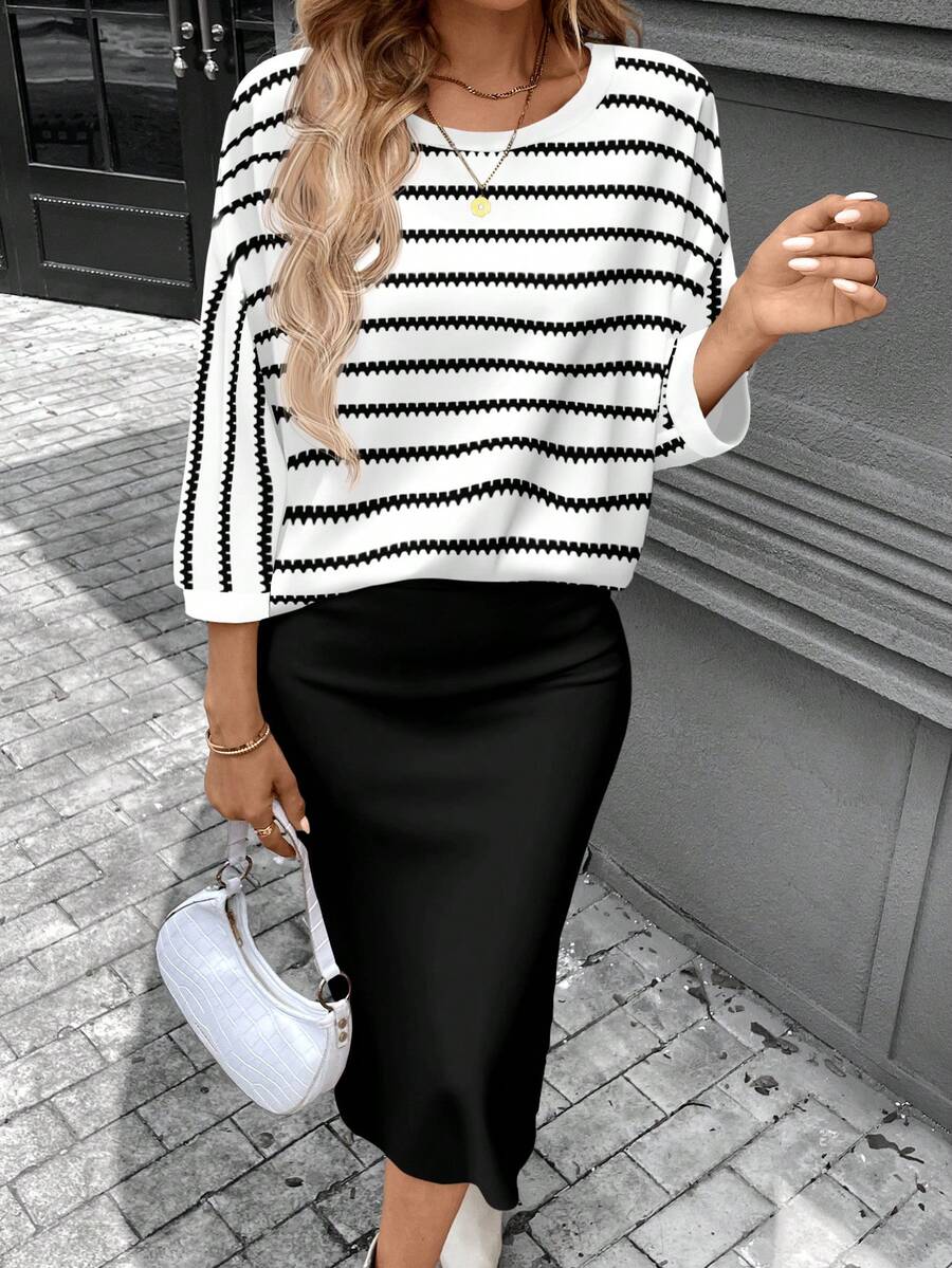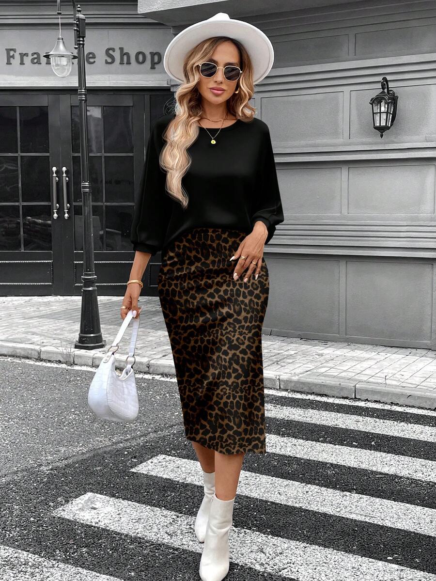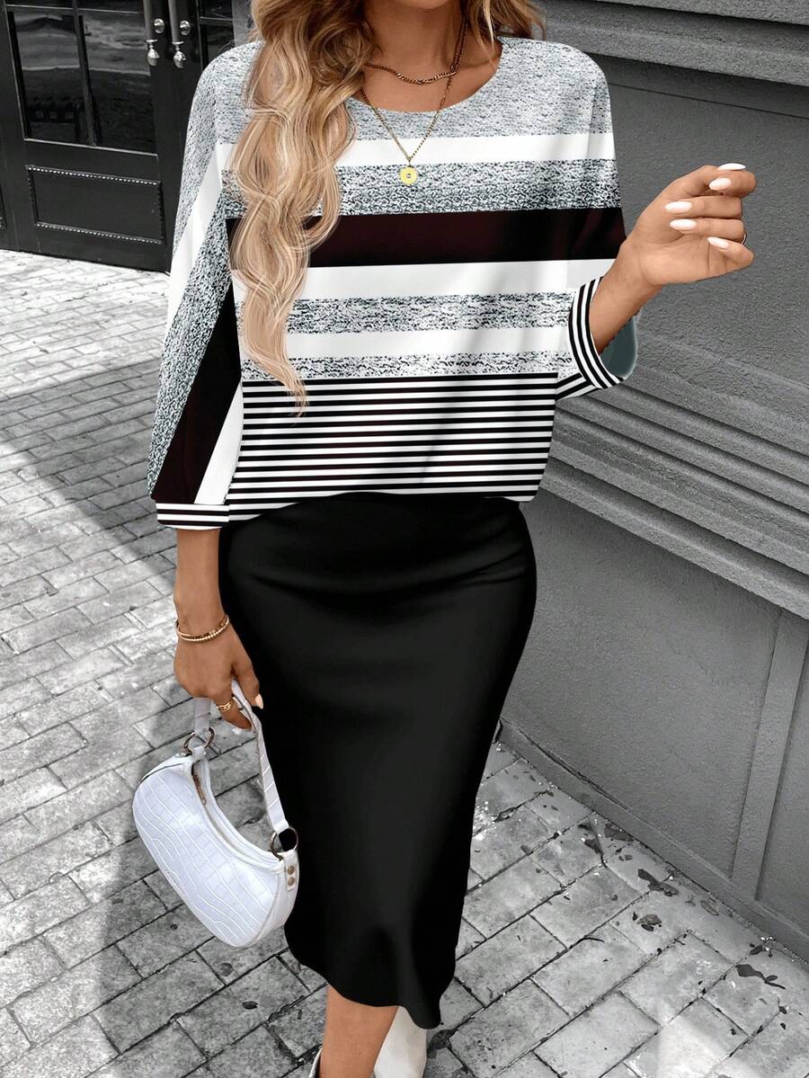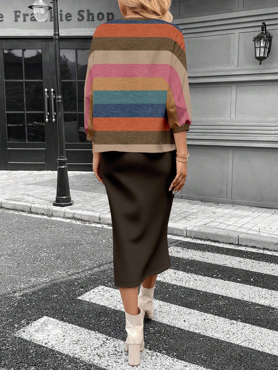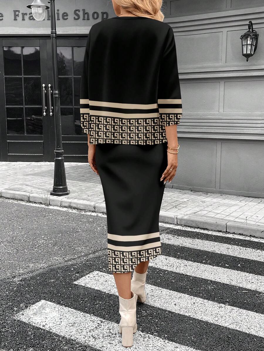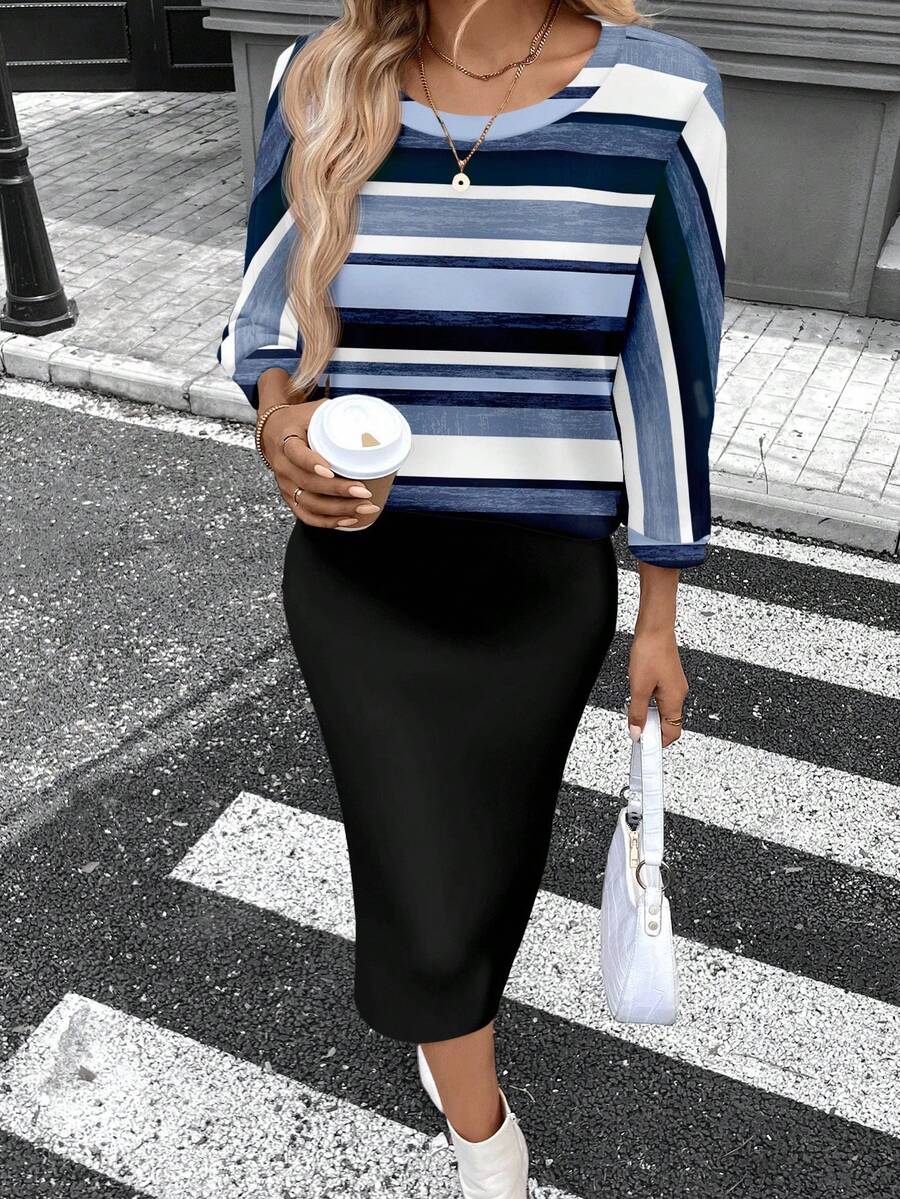 SHEIN LUNE Conjunto de camiseta feminina com gola redonda e manga morcego e saia reta justa, tecido com textura canelada felpuda, elegante para deslocamento casual, quente para outono/inverno