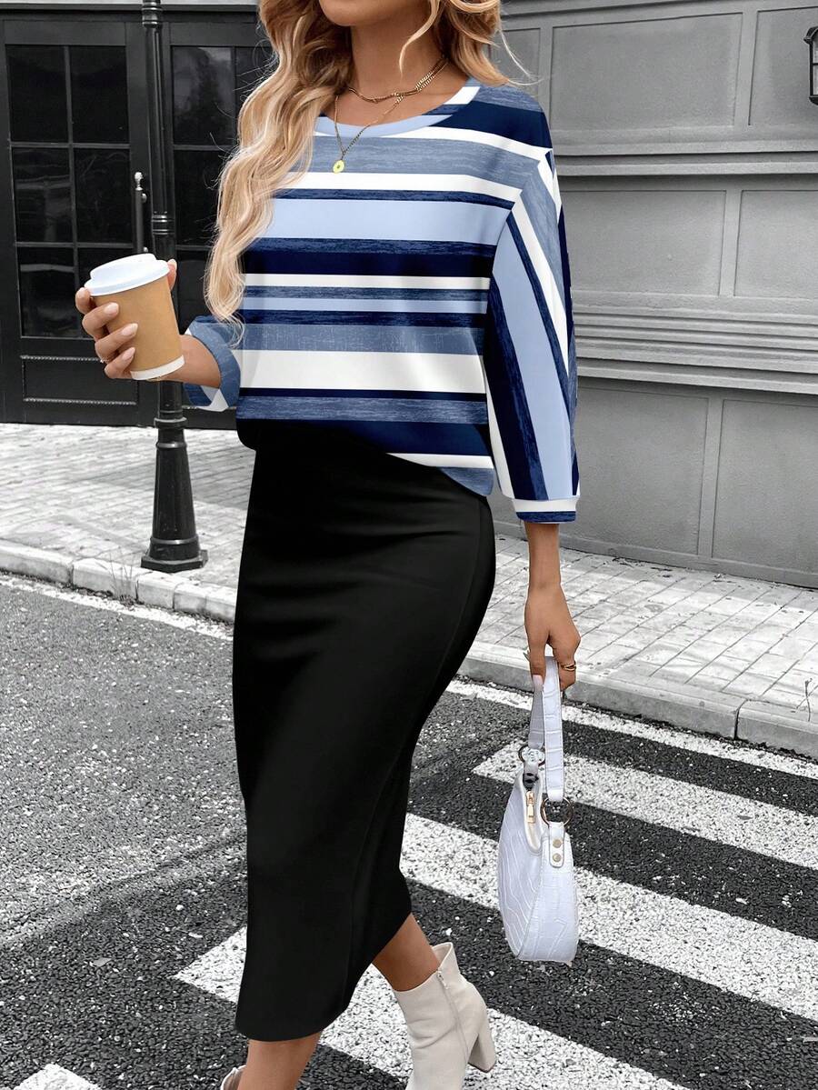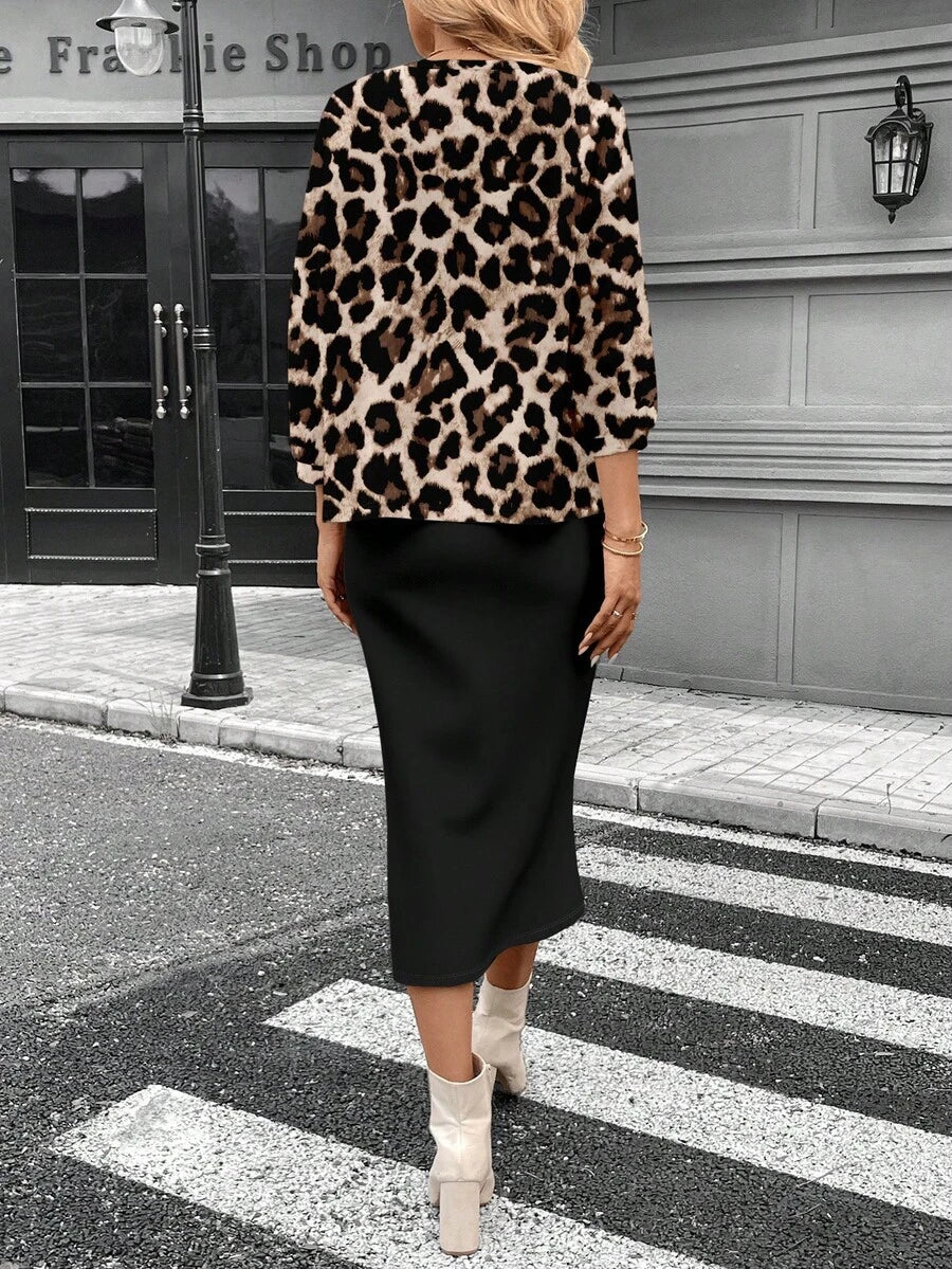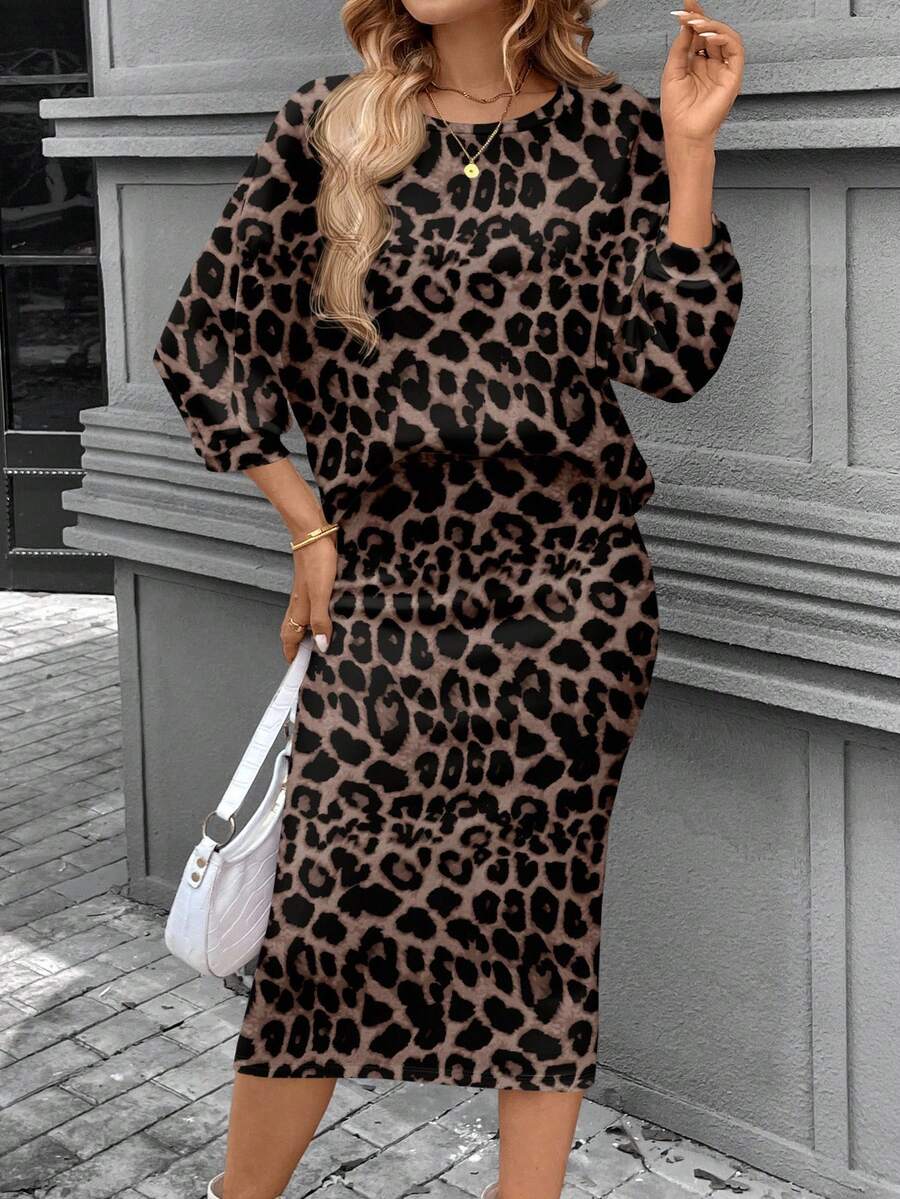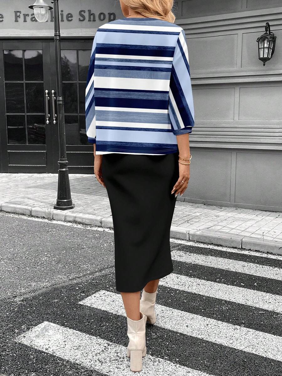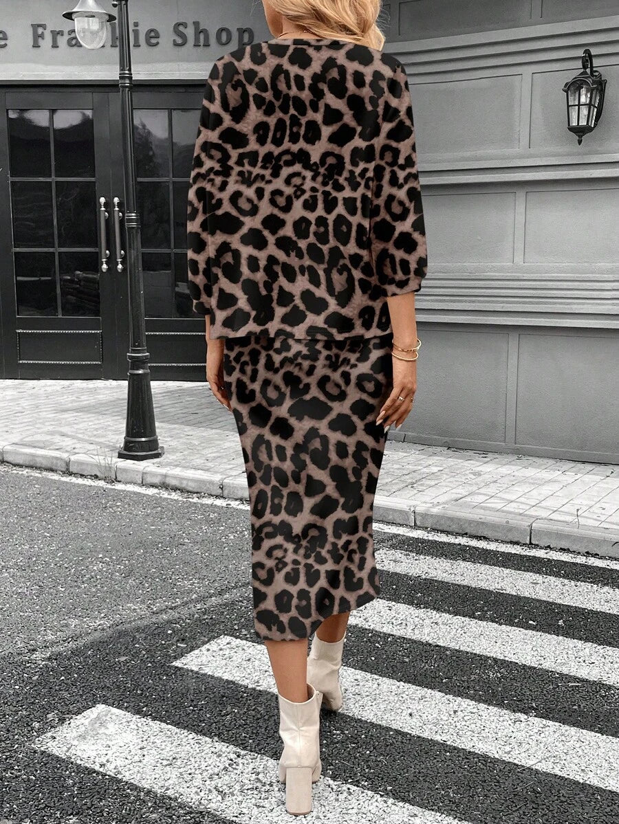 SHEIN LUNE Conjunto de camiseta feminina com gola redonda e manga morcego e saia reta justa, tecido com textura canelada felpuda, elegante para deslocamento casual, quente para outono/inverno